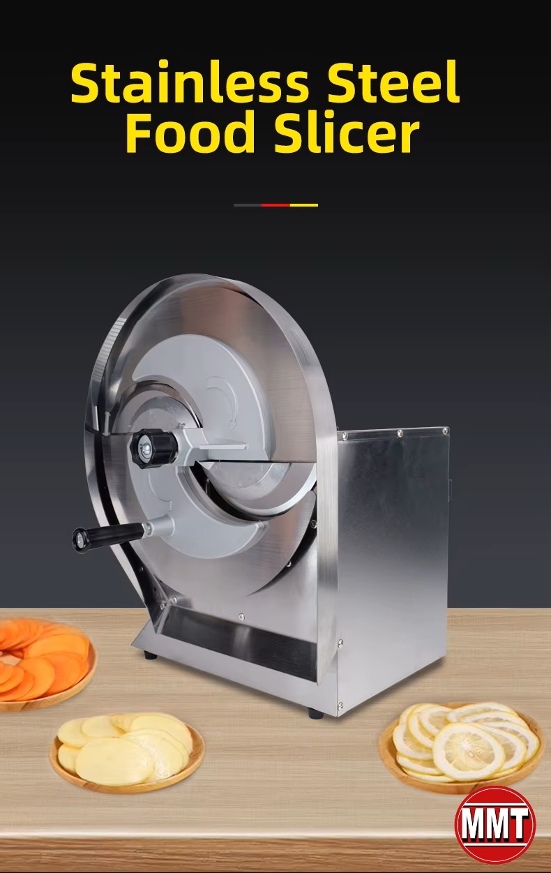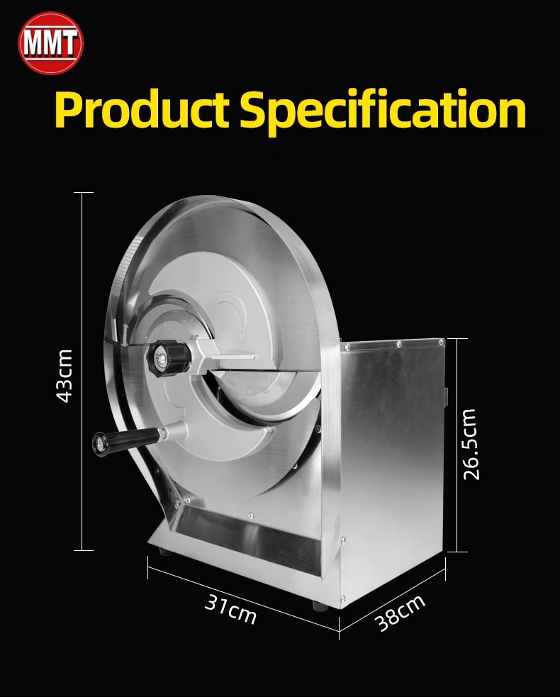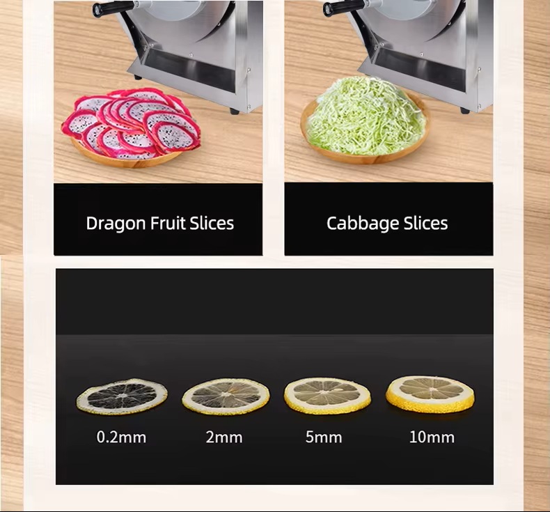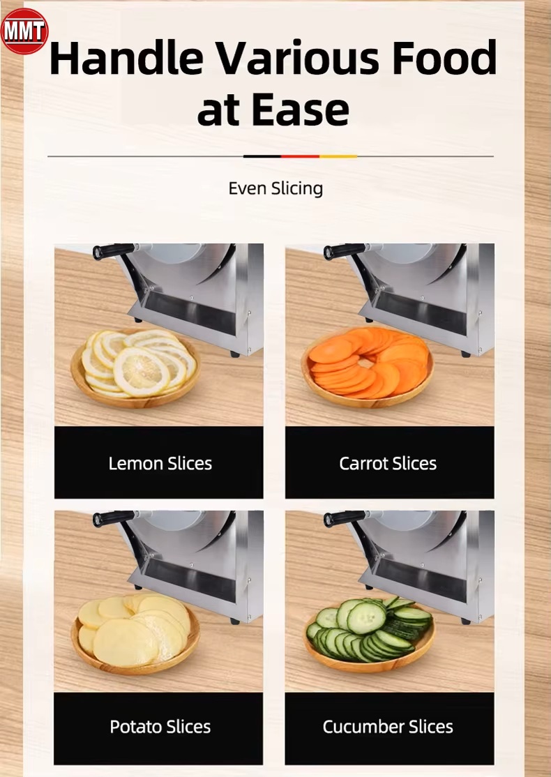This commercial vegetable slicer features a detachable blade for easy cleaning, a 201# stainless steel body, and a 410# stainless steel blade. It offers precise slicing with adjustable food thickness ranging from 0.3-5mm and ensures stability with non-slip feet. Suitable for various industries including catering, frozen food processing, and beverage factories, it is certified CE / EU compliant, guaranteeing safety and market access.