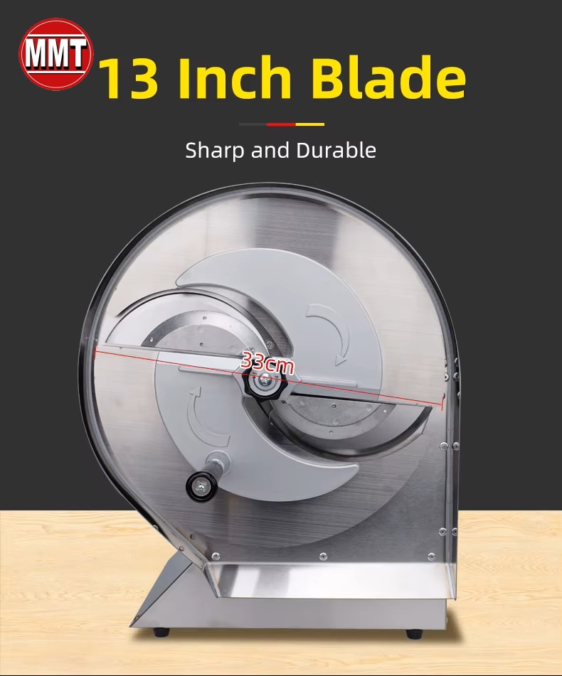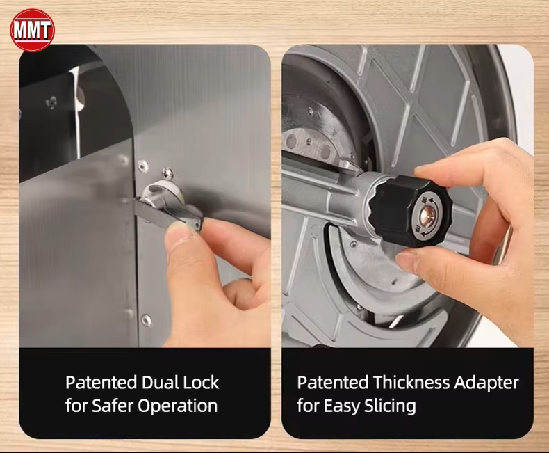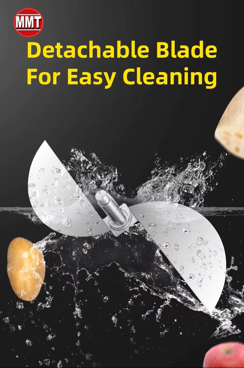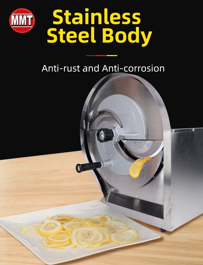 This commercial vegetable slicer features a detachable blade for easy cleaning, a 201# stainless steel body, and a 410# stainless steel blade. It offers precise slicing with adjustable food thickness ranging from 0.3-5mm and ensures stability with non-slip feet. Suitable for various industries including catering, frozen food processing, and beverage factories, it is certified CE / EU compliant, guaranteeing safety and market access.