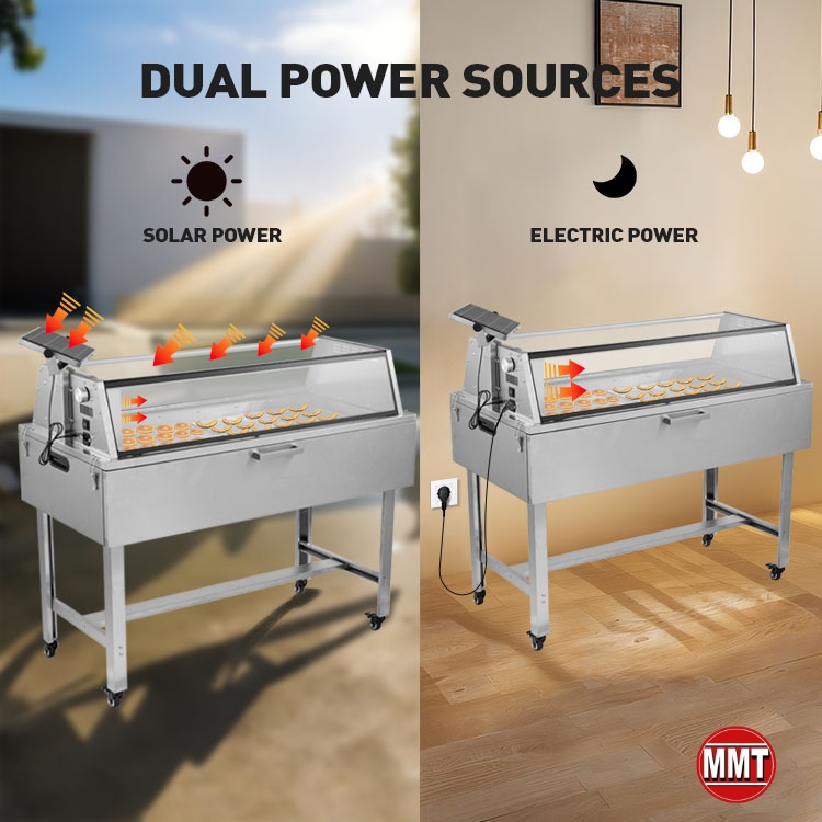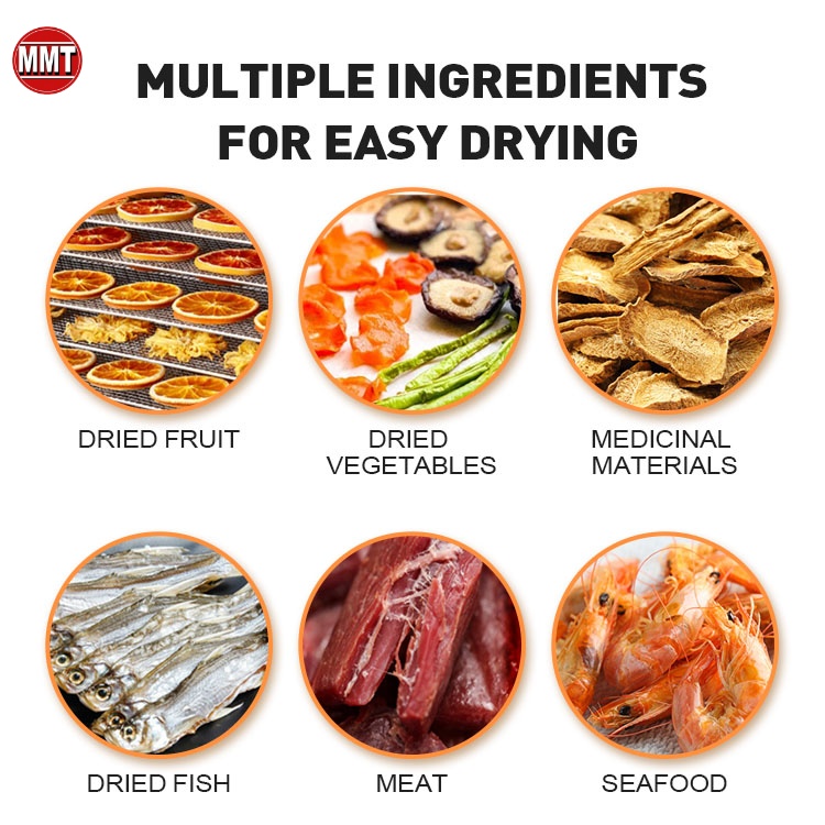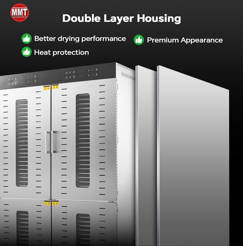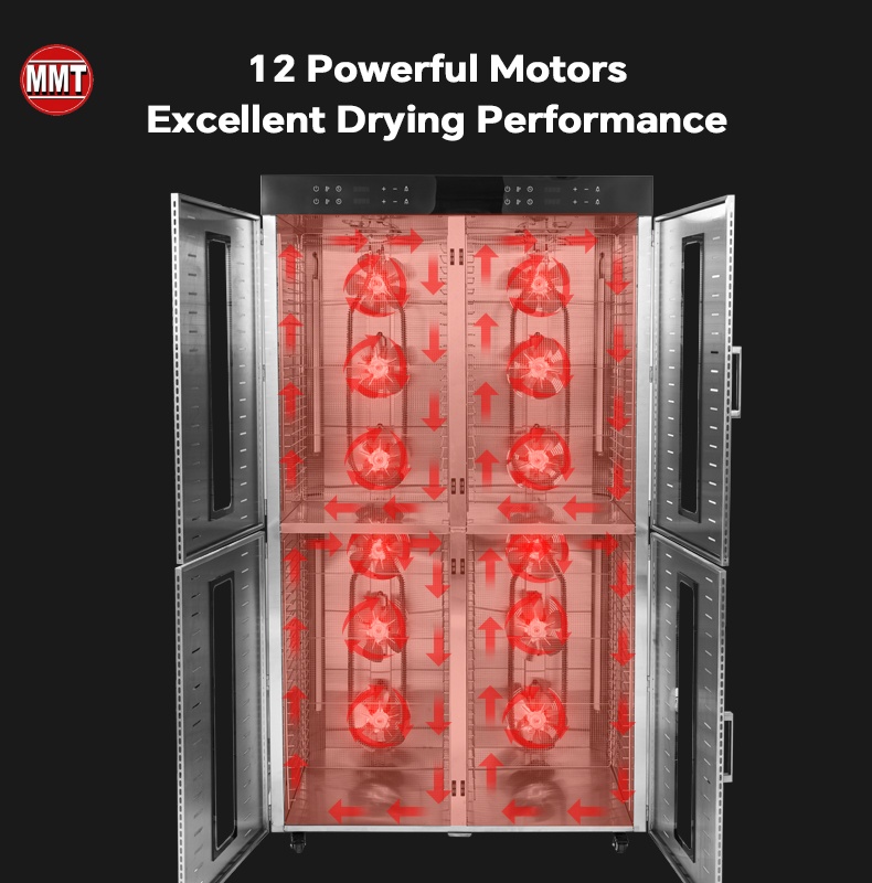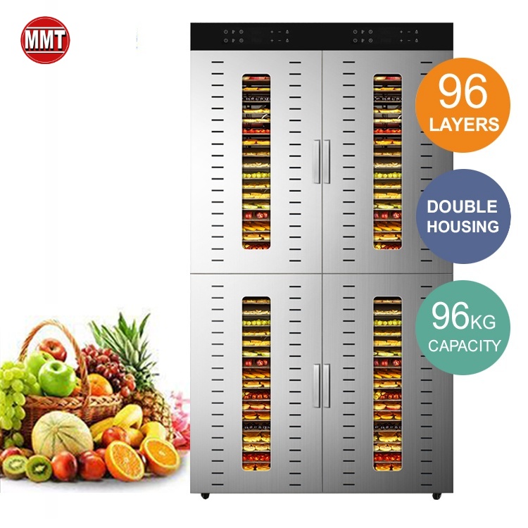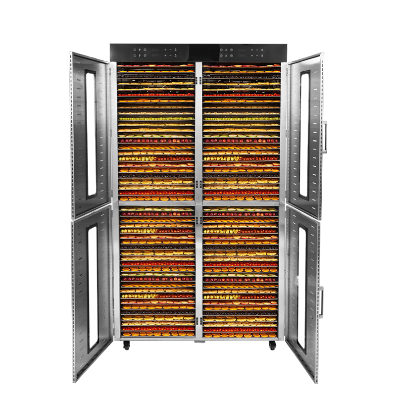 Industrial-grade food dehydrator features a large capacity with 96 trays, 7600W power, and 4 independently controlled cabinets, ensuring efficient drying for commercial use. It operates at a low noise level of 45-50 decibels, includes SUS304 trays for durability, and offers adjustable temperature (30-90℃) and timer settings (0-24 hours). Equipped with CE and FCC certifications, it ensures compliance with EU safety standards and electromagnetic compatibility, providing market access and reliability for users.